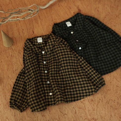 autumn collor コットン100%のナチュラルチェックになります。 ネックラインに沿って入っているギャザーでふわっとしたシルエットを作ります。 袖口はお子様に優しいゴム仕様です。